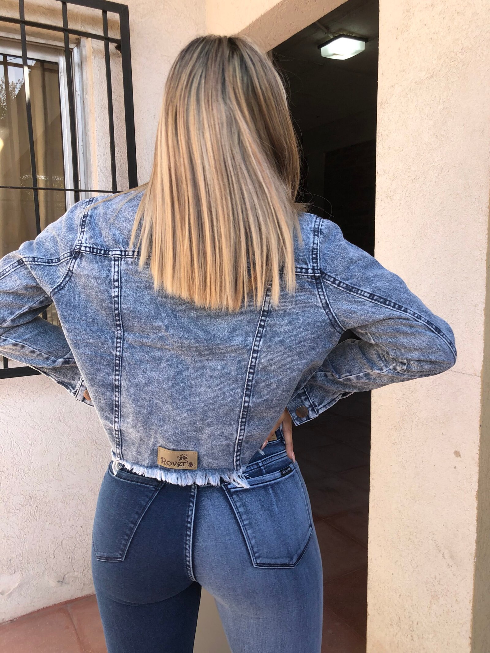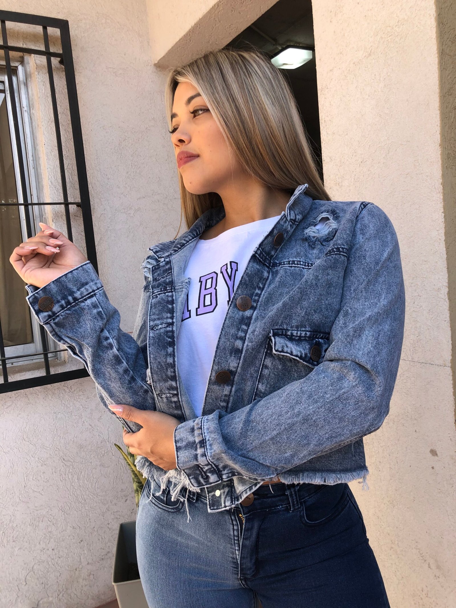 Corte: Silueta Crop, con un largo corto que termina en la cintura y un acabado de ruedo deshilachado (raw hem) que le aporta un estilo urbano y desenfadado. Presenta una estructura clásica con costuras reforzadas visibles.
