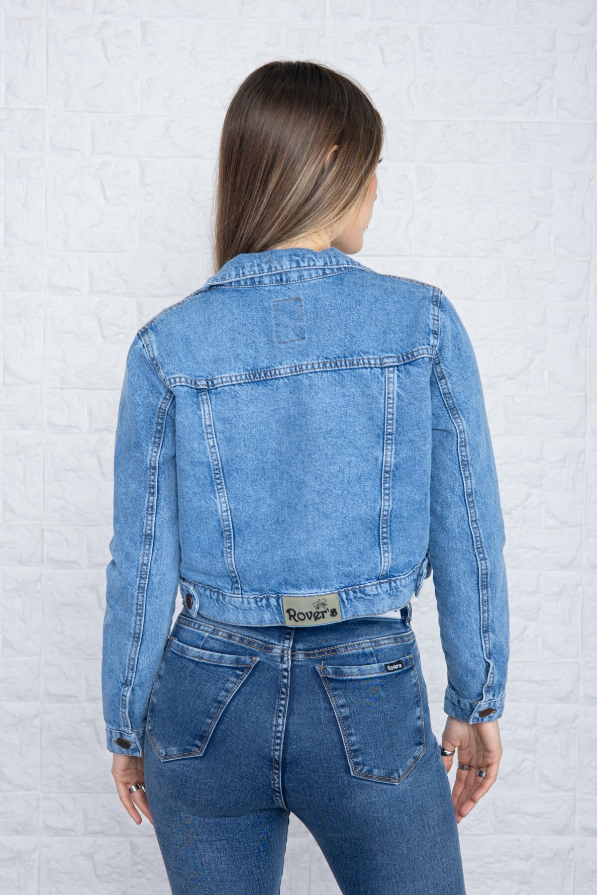Corte: Silueta Crop, con un largo corto que llega a la cintura para un estilo moderno y juvenil. Presenta un diseño clásico con cuello de solapa, cierre frontal mediante botones metálicos grabados y dos bolsillos de parche en el pecho con solapa y botón. Incluye costuras reforzadas visibles que realzan la estructura de la prenda.