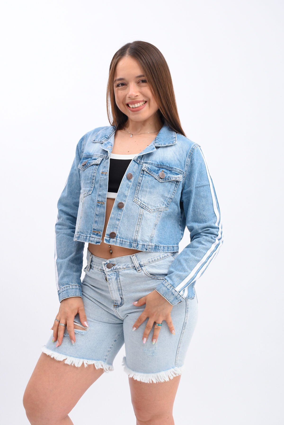 Corte: Silueta Crop, con un largo corto por encima de la cintura que aporta un estilo moderno y juvenil. Presenta un diseño clásico con cuello de solapa, cierre frontal mediante botones metálicos y dos bolsillos de parche en el pecho con solapa y botón. Destaca por un detalle deportivo de triple franja blanca lateral que recorre las mangas desde el hombro hasta el puño.