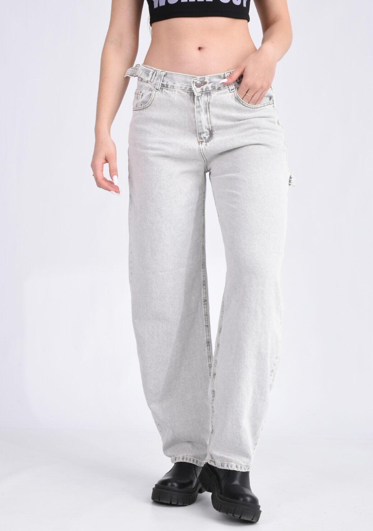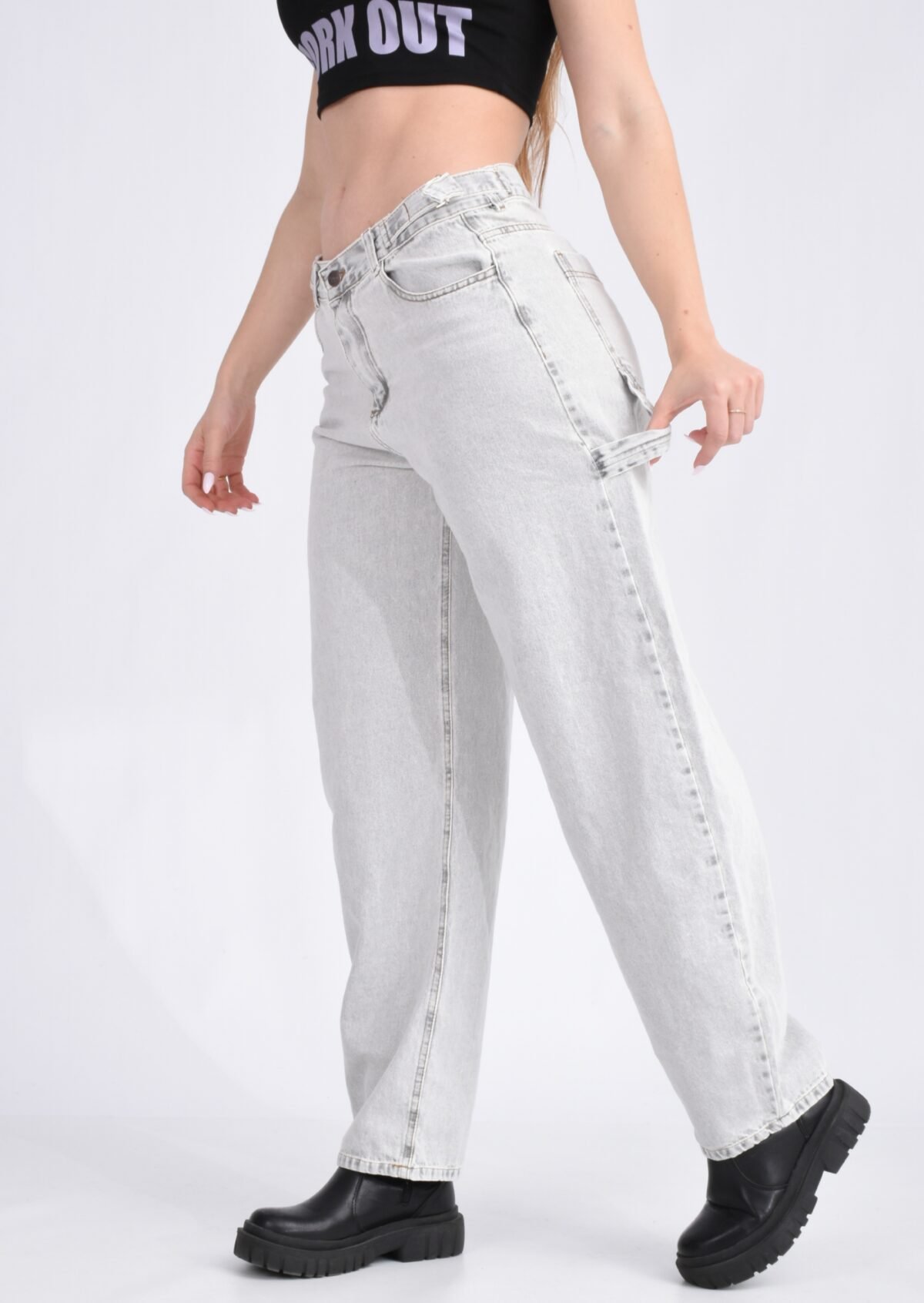 Detalles: Diseño clásico de cinco bolsillos, presillas para cinturón. El detalle principal es el corte holgado (Baggy) y la presilla de tela en la parte lateral superior. El ruedo es terminado con costura simple. Cierre de cremallera con botón metálico.