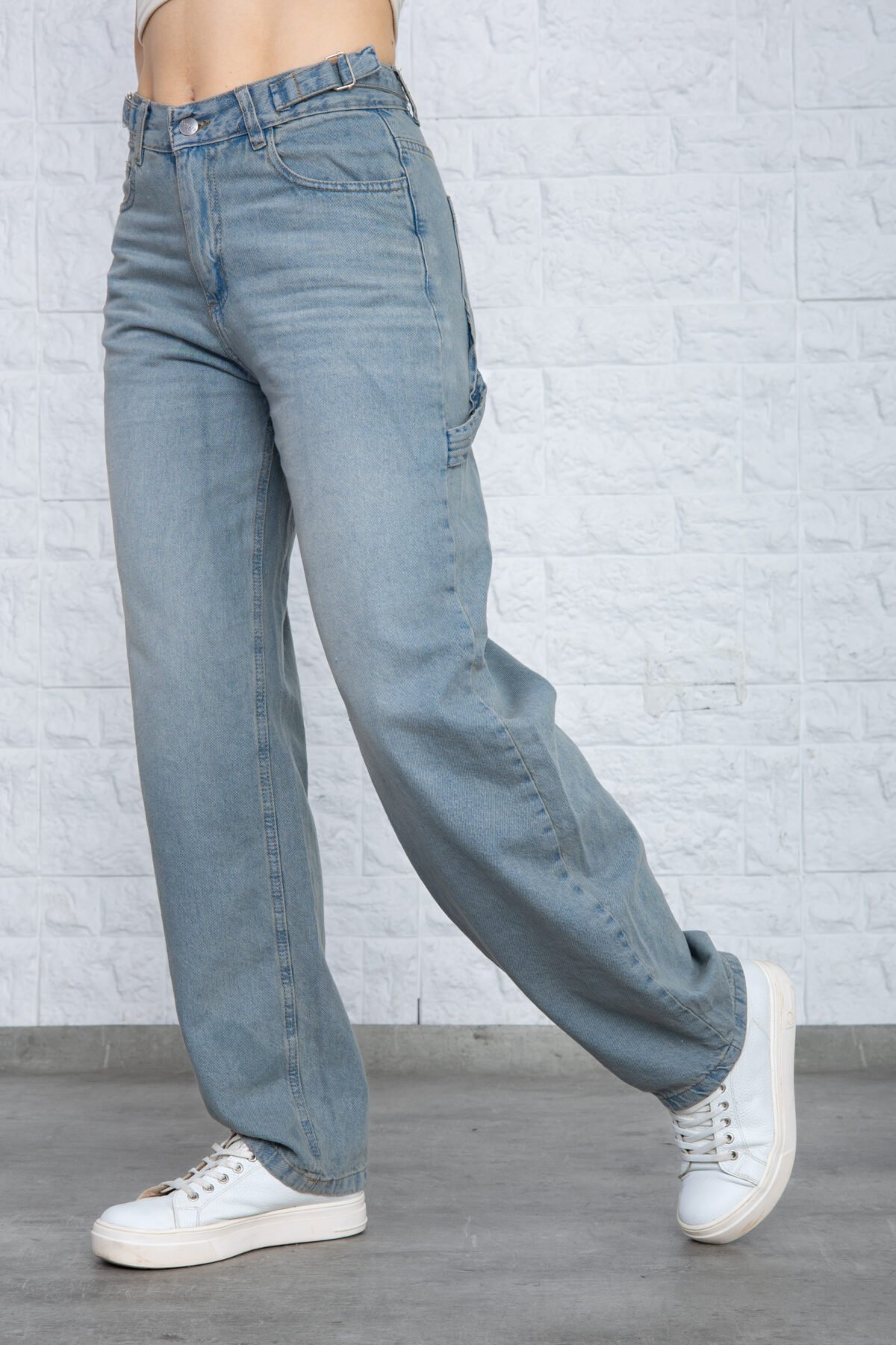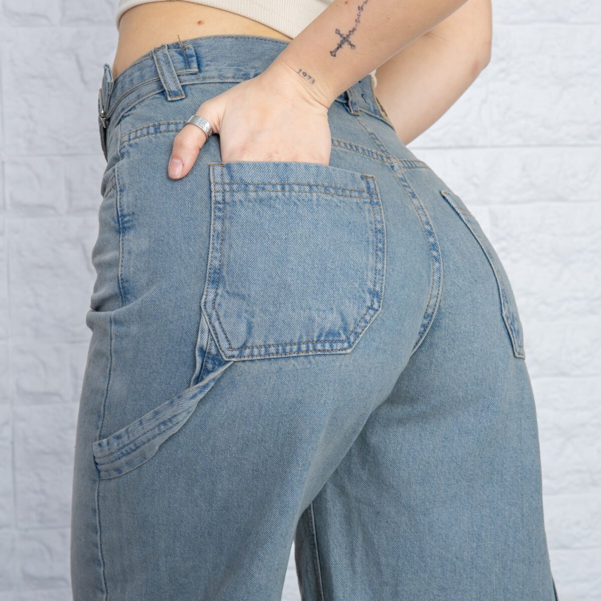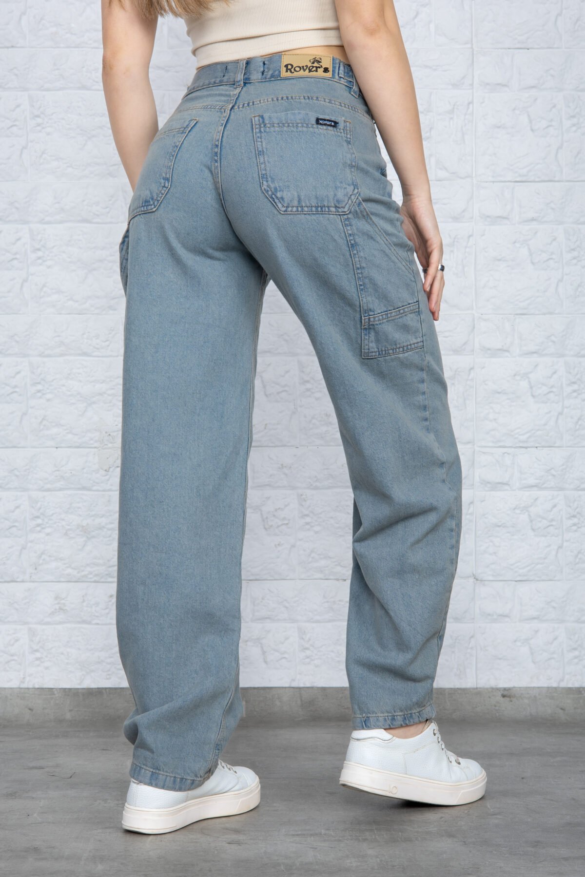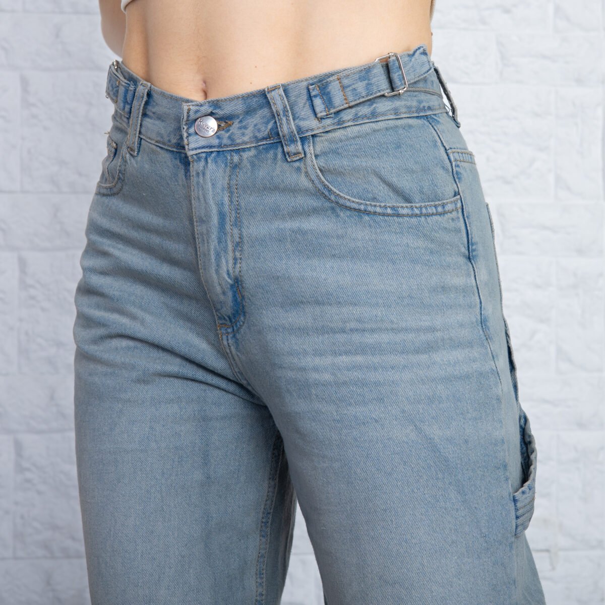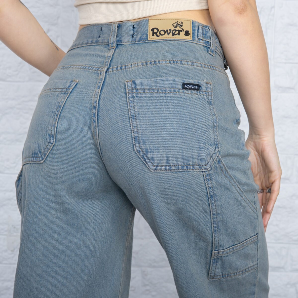 Detalles: Diseño clásico de cinco bolsillos, presillas para cinturón. El detalle principal es el corte holgado (Baggy) y el bolsillo lateral utilitario tipo carpintero, que incluye un pequeño bolsillo o presilla extra. El ruedo es terminado con costura simple. Cierre de cremallera con botón metálico.