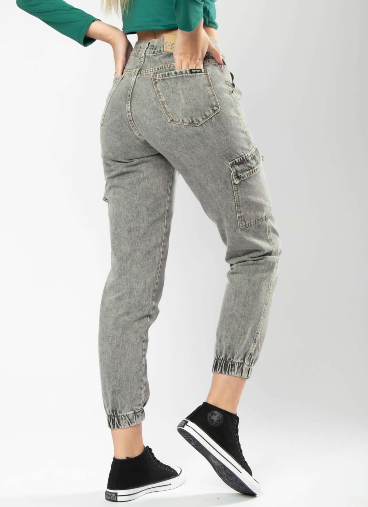Corte: Silueta Cargo Jogger, con un calce holgado en las piernas que se ajusta en los tobillos mediante un acabado elástico fruncido. Presenta un diseño funcional con bolsillos laterales tipo cargo con solapa a media pierna, además de bolsillos delanteros amplios con costuras reforzadas visibles. | Tiro: Alto.