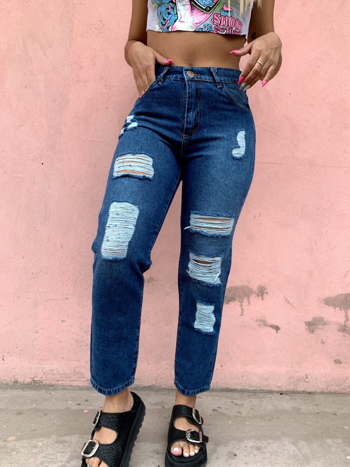 JEAN MOM RIGIDO AZUL CON ROTURAS LASER.