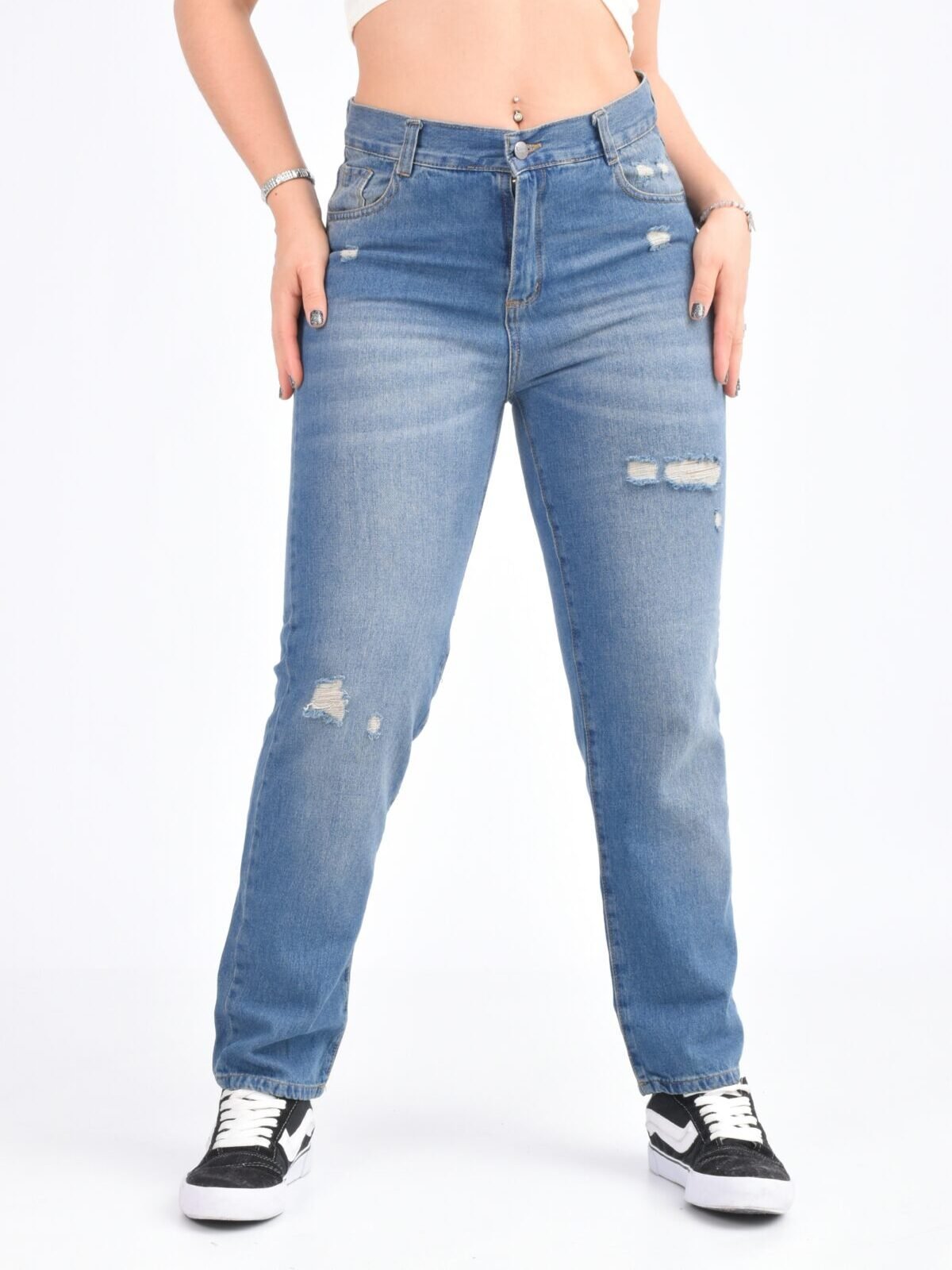 JEAN MOM RIGIDO AZUL OXIDO CON ROTURAS LASER