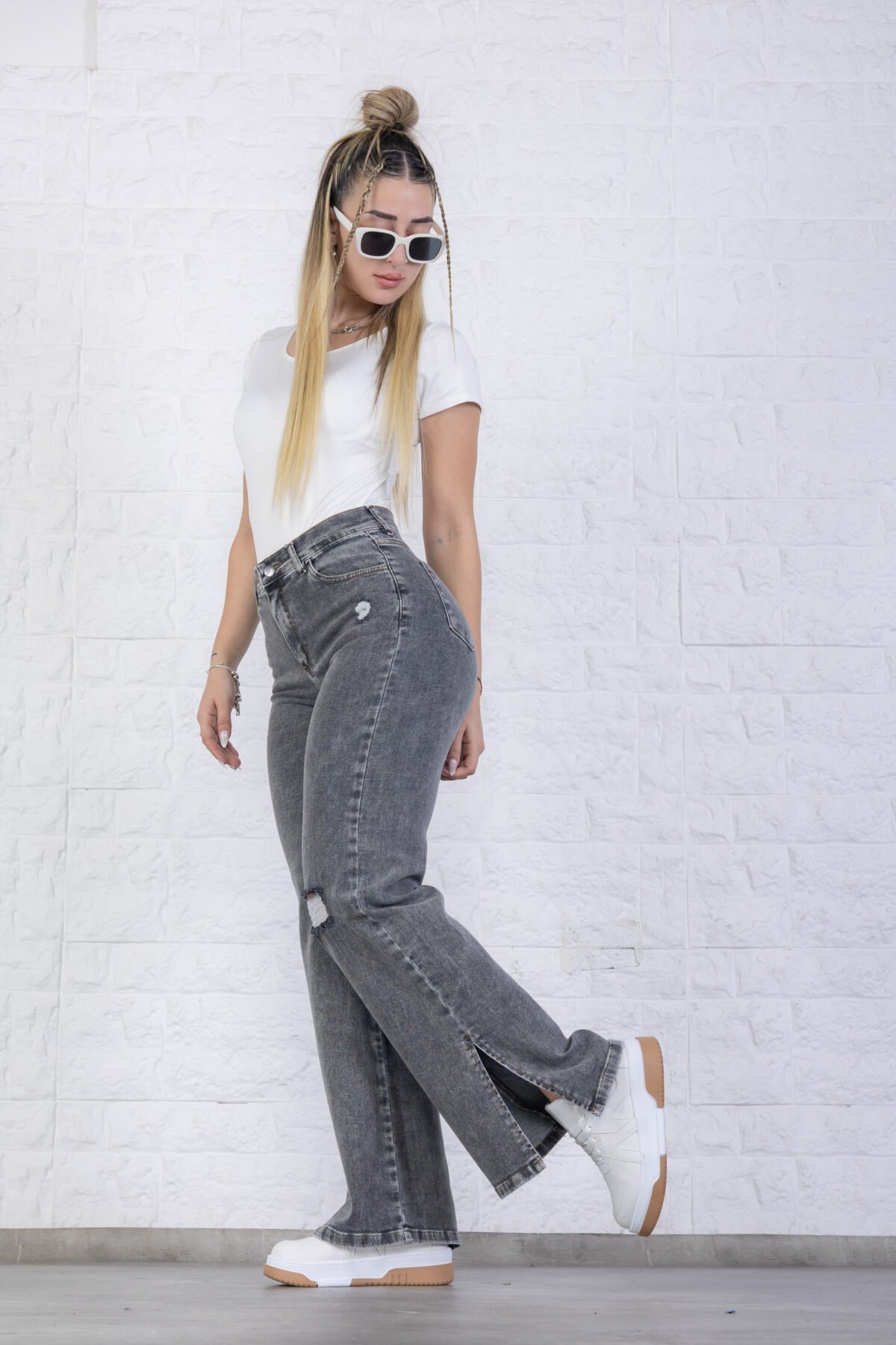 JEAN WIDE ELASTIZADO GRIS CON AVERTURA EN LA BOTA