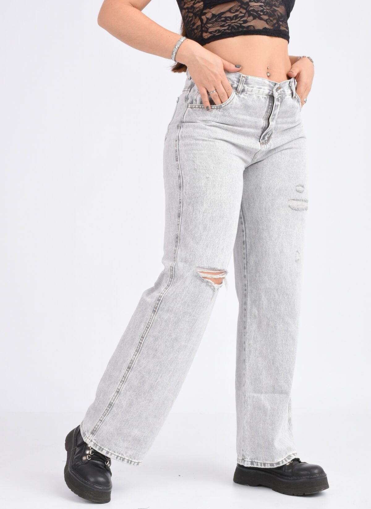JEAN WIDE GREY RIGIDO CON ROTURAS LASER