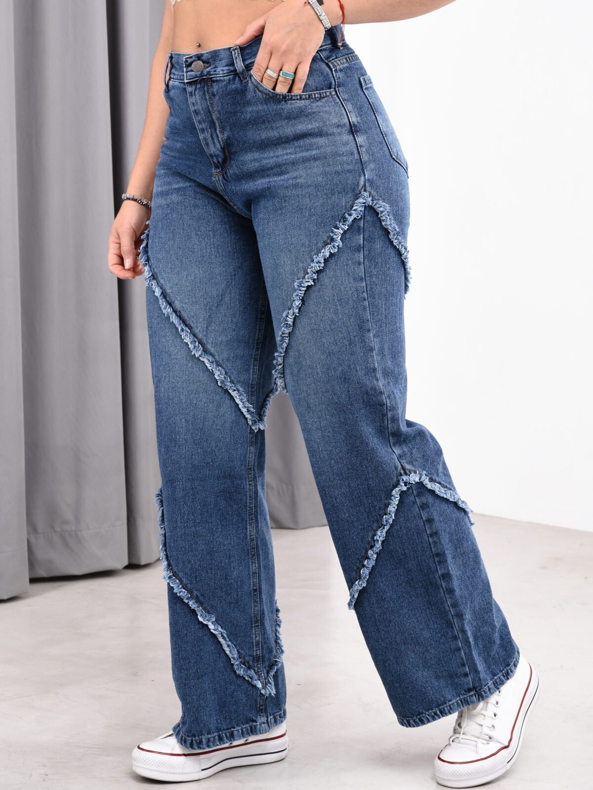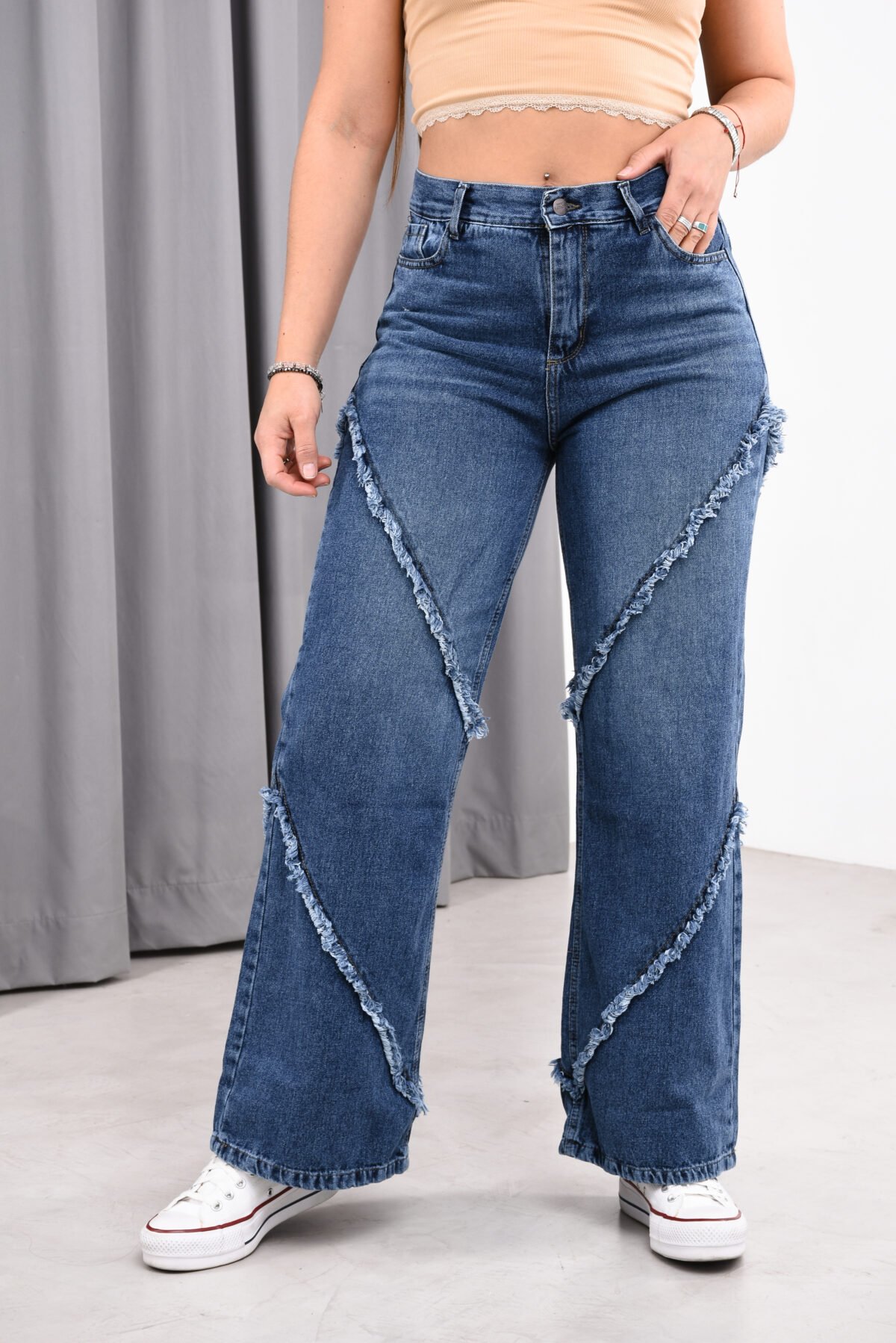 Corte: Silueta de pierna ancha y recta (Wide Leg) con calce holgado. Presenta un diseño distintivo con costuras externas deshilachadas en forma de zigzag que recorren el frente de ambas piernas. | Tiro: Alto.