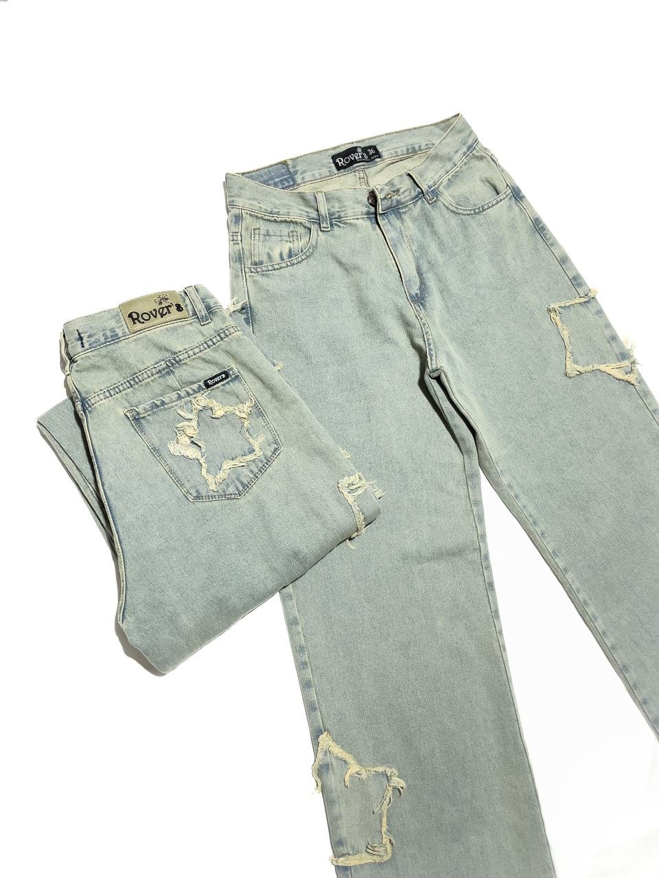 Corte: Silueta de pierna recta y holgada que brinda comodidad y un estilo relajado. Destaca por sus originales apliques en forma de estrellas deshilachadas distribuidas de manera asimétrica en el frente y sobre uno de los bolsillos traseros, aportando un diseño urbano y creativo. Incluye bolsillos delanteros redondeados, bolsillo relojero, bolsillos traseros funcionales y un ruedo con terminación de costura simple. | Tiro: Alto.