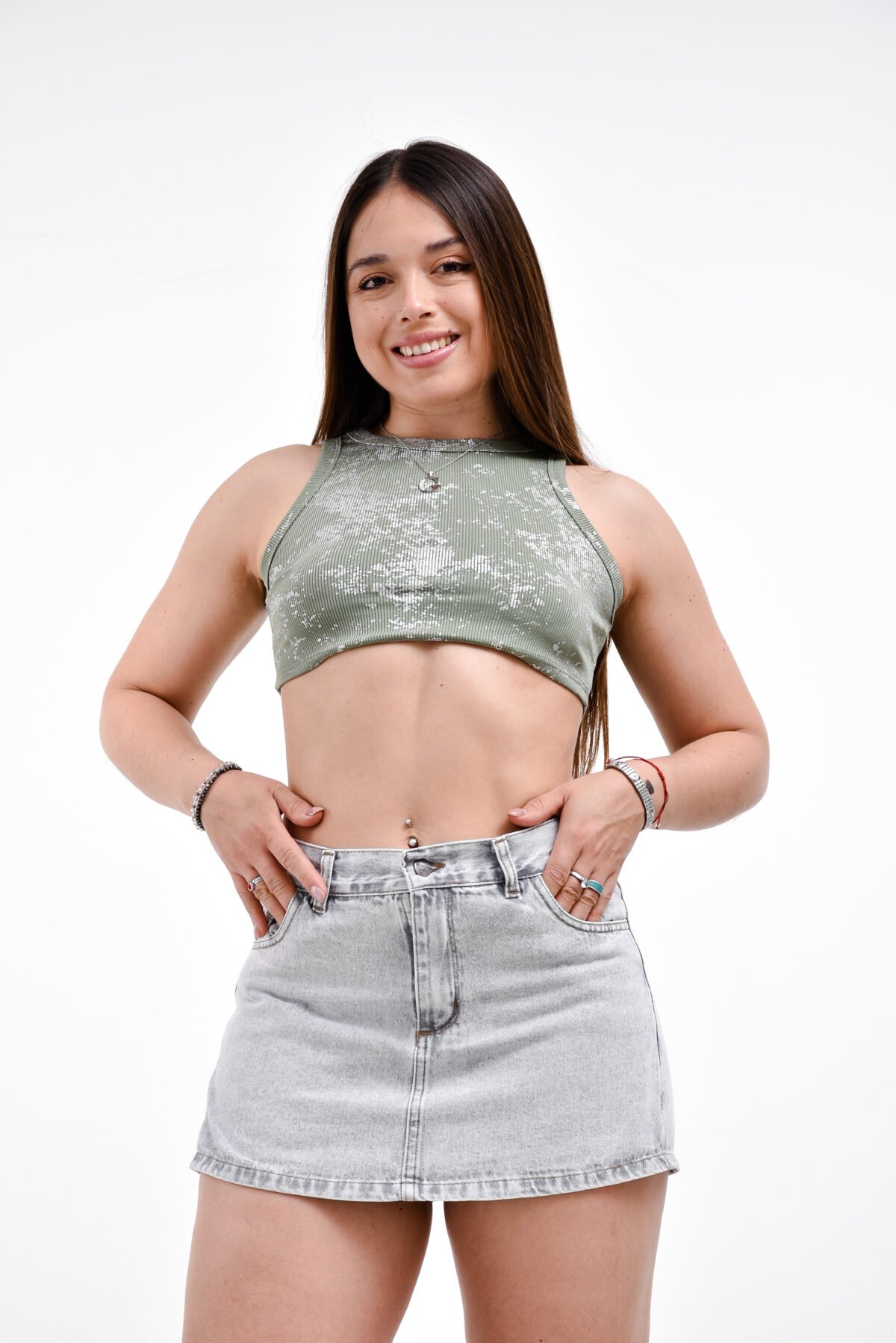 Tipo de prenda: Short-Pollera (Skort) de mezclilla con diseño de doble capa. | Tipo de denim: Denim rígido.