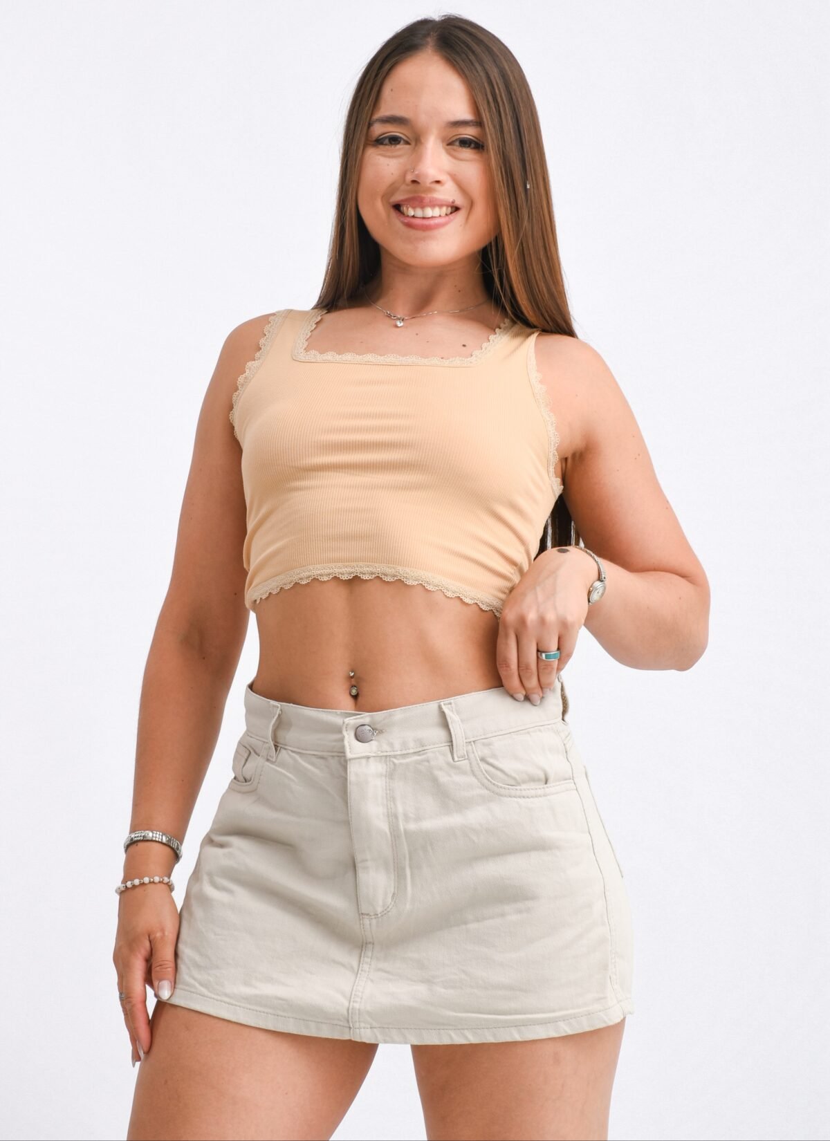 Corte: Mini short, con la capa exterior simulando una mini falda en el frente. | Tiro: Medio/Alto.