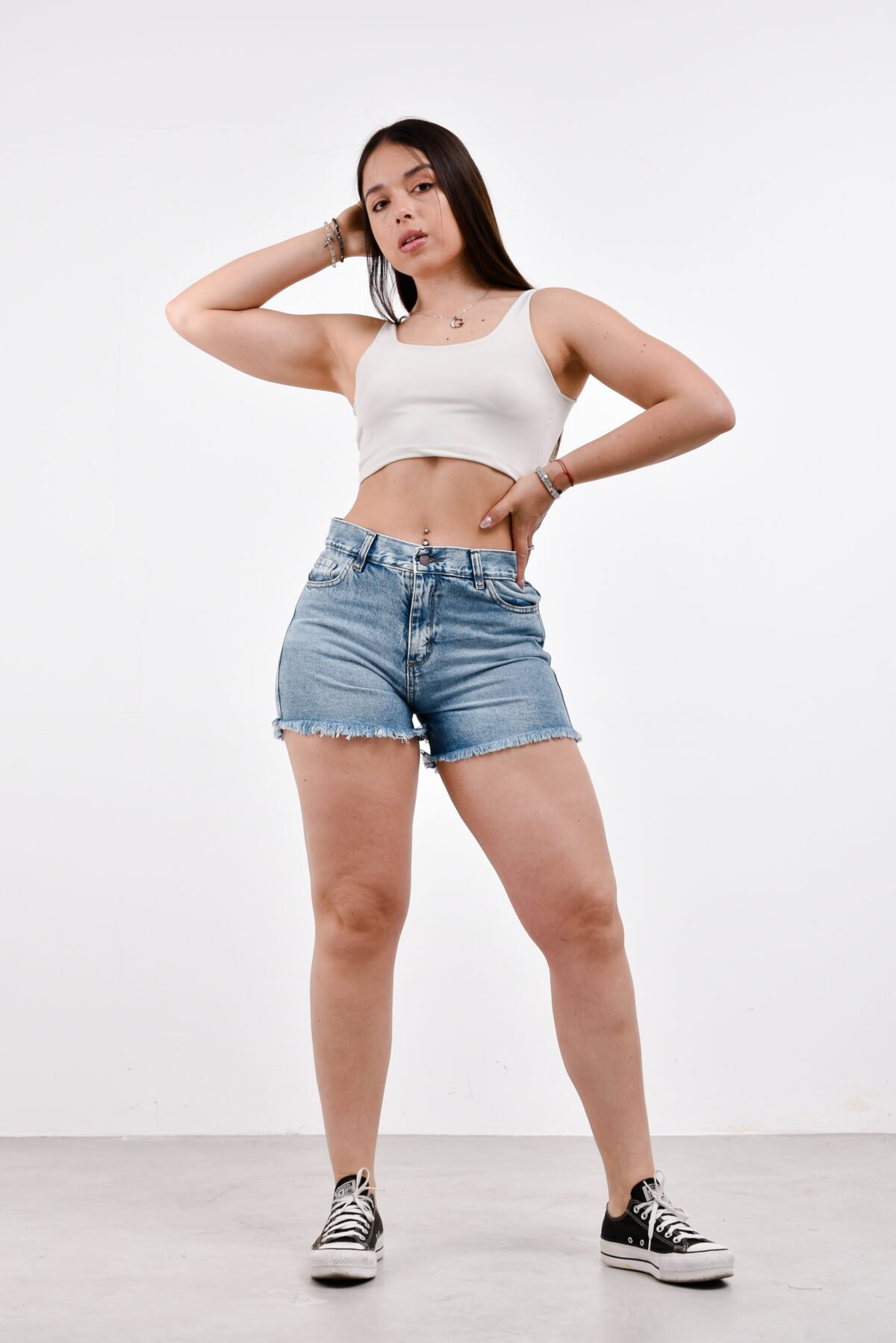 Detalles: Diseño clásico de cinco bolsillos, presillas para cinturón. El ruedo es deshilachado y flecado, pero con un fleco más corto y discreto que otros modelos. Cierre de cremallera con botón metálico.