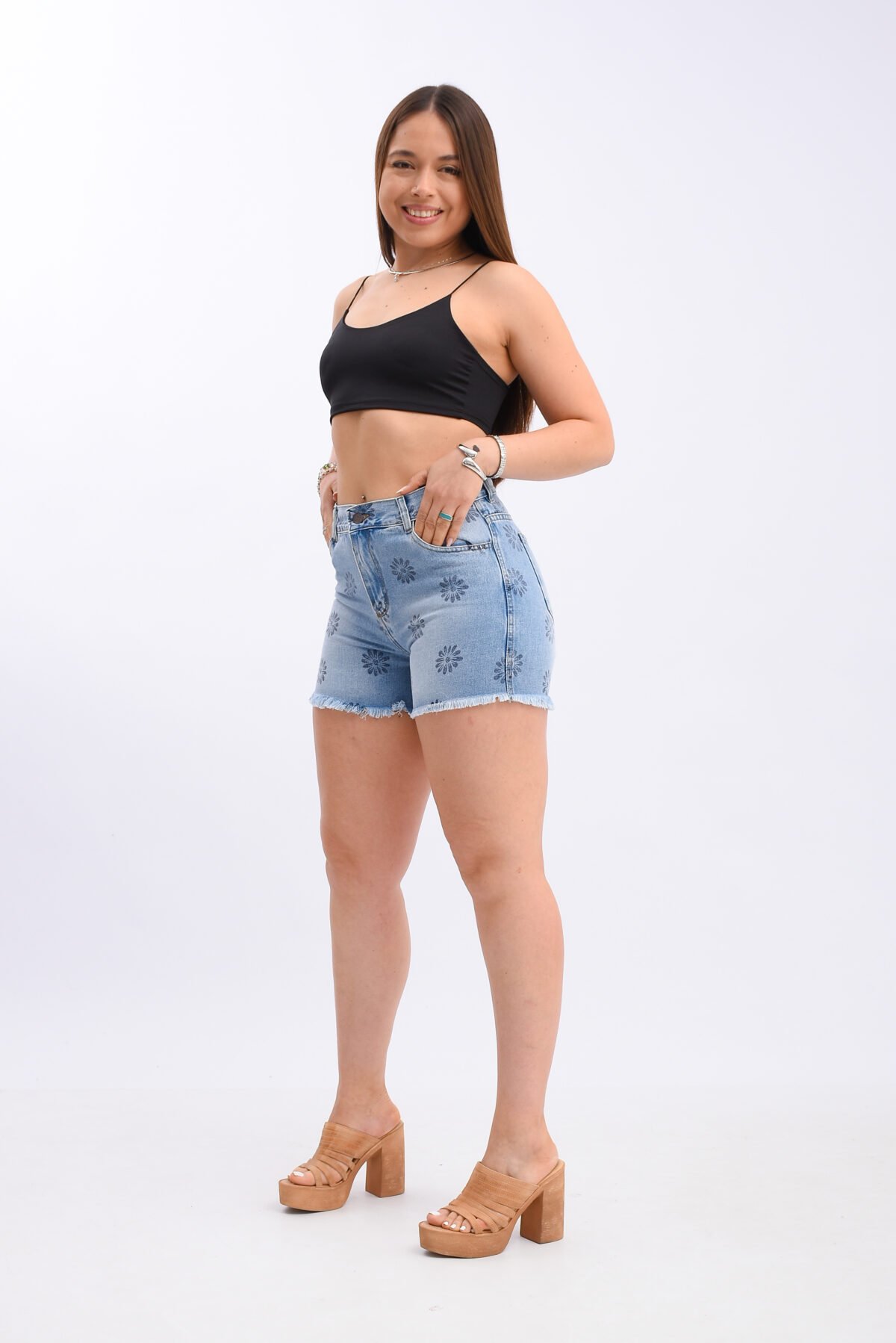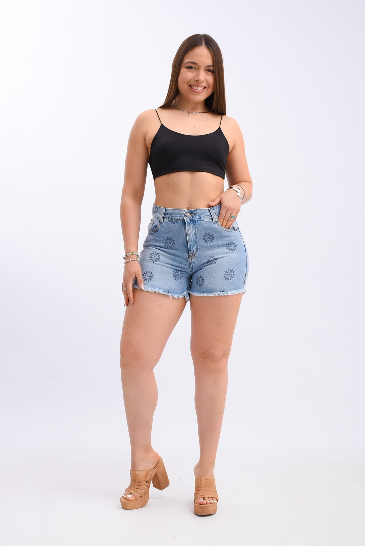 Detalles: Diseño clásico de cinco bolsillos. El detalle principal es el estampado repetitivo de flores (margaritas) en tono más oscuro sobre toda la prenda. El ruedo es deshilachado y flecado. Cierre de cremallera con botón metálico.